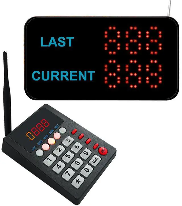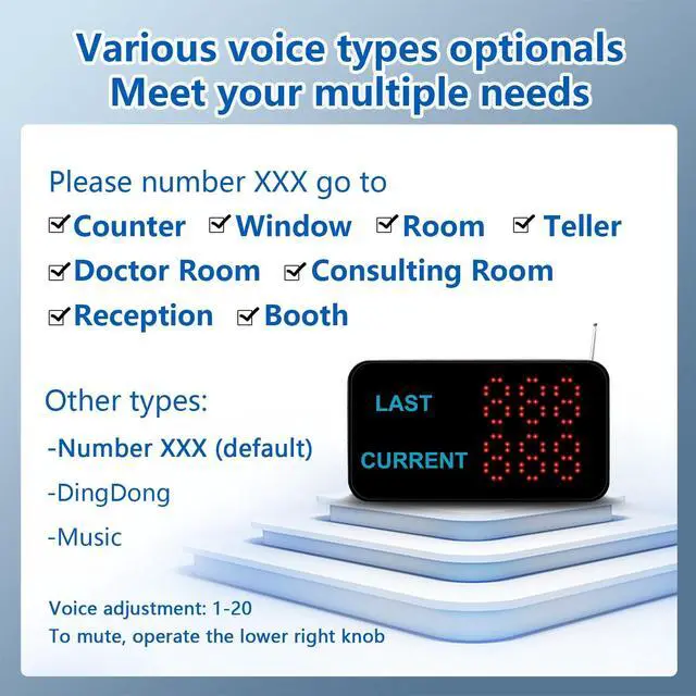 4. The customer's number will show on the display screen with prompt voice, so that customer know which counter they should attend. Wireless queue call system set includes: (1)