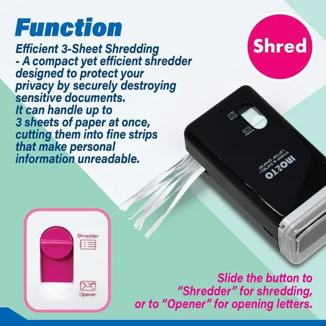 This compact three-in-one multi-functional device is the perfect solution for all your document security needs. Featuring a handheld paper shredder, envelope opener, and confidential seal, it offers convenience and efficiency in one sleek package. The mini paper shredder can effortlessly shred up to three sheets of paper at a time, available in five vibrant colors to match your style. Ideal for home or office use, this cross cut shredder ensures your sensitive documents and credit card details are securely destroyed. Its portable design makes it a great choice for small spaces, while the heavy duty performance rivals larger shredders.
