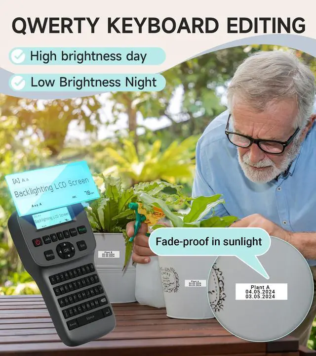 KEYBOARD BLUETOOTH LABEL MAKER - Bluetooth label maker machine with multiple pre-templates/ fonts/ icons/ borders/ languages for Smartphone QWERTY keyboard label maker with built-in cutter for the elderly and children or outdoor workers in network-less environment LM1600 labeler with backlighting LCD Screen for dark environments Auto shrink ribbon function makes label less prone to jamming.