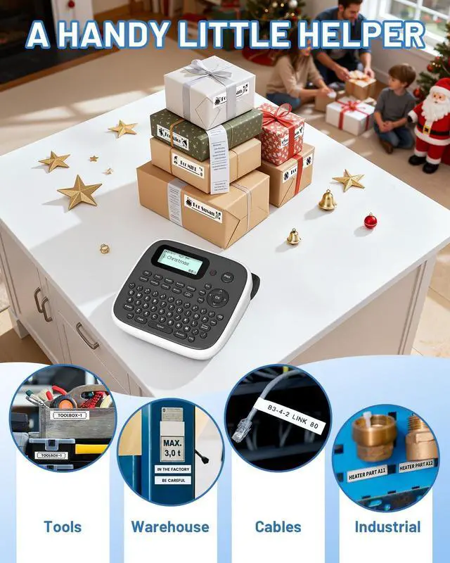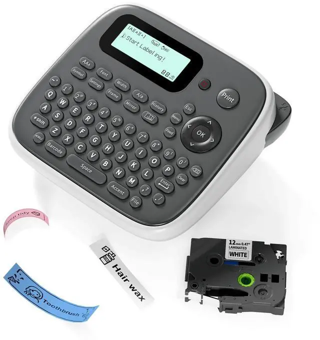 DUAL POWER SUPPLY - Type-C & Battery PoweredThe EazeID D210S label maker machine with tape versatile power options with included Type-C cable for continuous use or 6 AAA batteries for portable labeling anywhere. Perfect for home office, outdoor projects, and on-the-go organization needs ^^ STANDALONE QWERTY KEYBOARD - No Phone RequiredThe handheld label makers easy-to-use QWERTY keyboard with one-touch smart keys provides instant access to 640+ symbols, 16 font styles, and 100+ frames. Suitable for all ages - from kids to seniors, no smartphone or computer needed ^^ WATERPROOF LAMINATED LABELS - Indoor & Outdoor UseUtilizing thermal transfer printing, the EazeID label maker machine printing creates durable, waterproof labels resistant to fading, abrasion, and temperature changes.