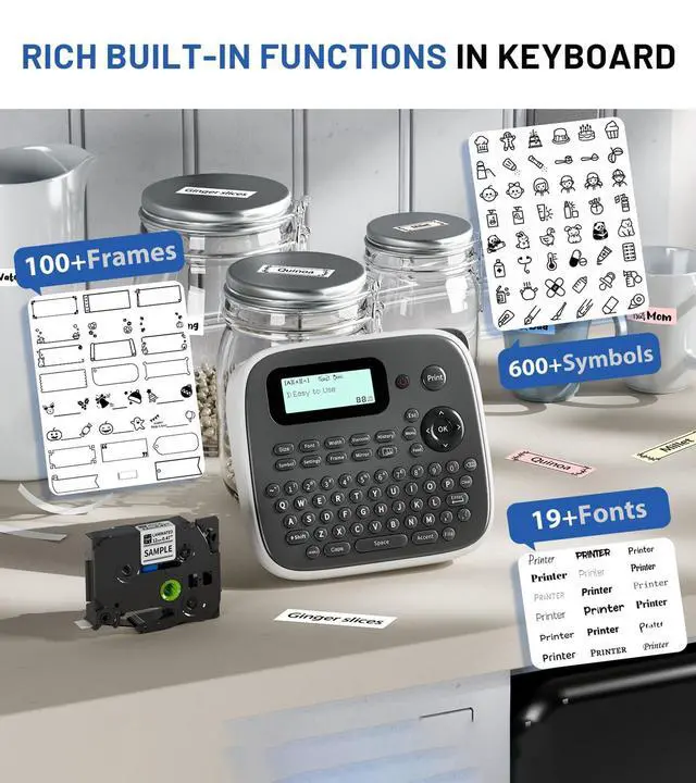 Includes 1/2" x 26ft black-on-white tape for immediate use ^^ VERSATILE ORGANIZATION SOLUTION - Multi-Scene ApplicationThe EazeID D210S labeler machine is perfect for home, office, school, and business organization. Label kitchen containers, office files, school supplies, garden tools, and more. Practical gift for home office classroom teachers kids friends lovers, organizing enthusiasts and busy families ^^ EFFICIENT BATCH PRINTING - Save Time & Tape The label maker machine with labels waterproof equip with multi-copy editing allows printing up to 21 different labels continuously. Narrow margin setting reduces tape waste.