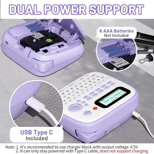 The D210S purple portable label maker machine with tape provides flexible two power options to suit your needs. It can operate indoors using just the included USB-C cable plug in to stay powered (no batteries required), or run solely on 6 AAA alkaline batteries (no need cord) printing anywhere outdoors. This combination of adaptable power and a portable design allows you to create professional labels anytime, anywhere, making your work and life easier ^^