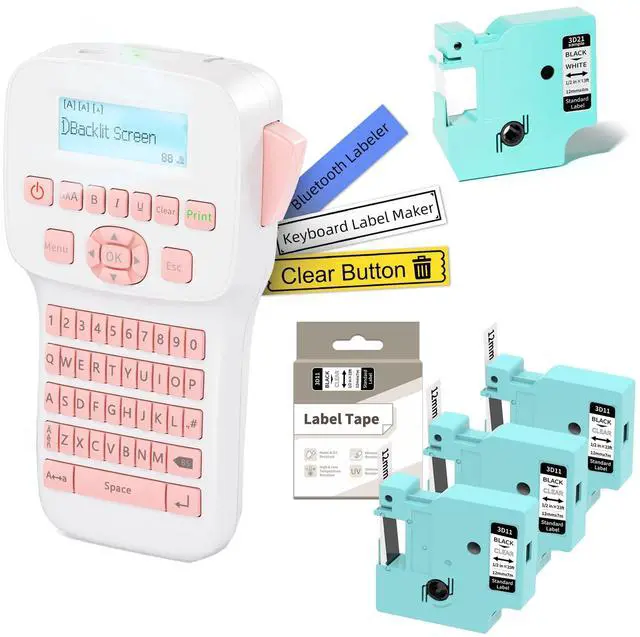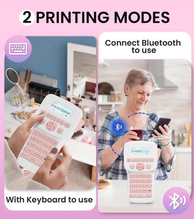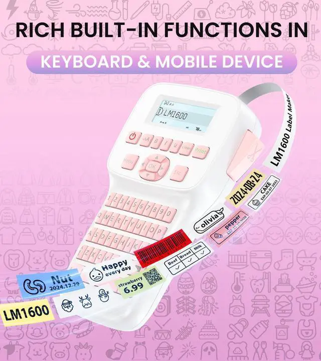 Label Maker Machine with 4PK Clear Tapes, Rechargeable Pink Label Maker with Keyboard, Bluetooth Labeler Machine LM1600, Backlit Screen, Multiple Symbol Icon Style Templates Easy to Use Inkless