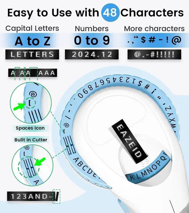 Ergonomic Design Labeler : The EazeID 3D Embossing Label Printer features an ergonomically designed handle for easy pressing. The built-in cutting design and pre-cut dividers make it convenient to peel off labels, while the dotted lines facilitate hassle-free labeling