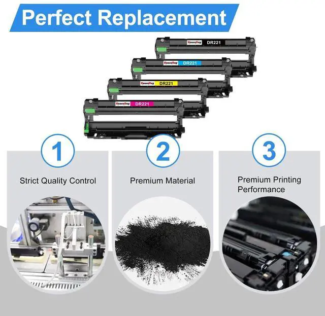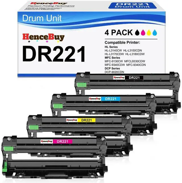 Product NameReplacement for Brother DR221 DR221CL DR-221CL Drum Unit ^^ Compatible PrintersFor Brother HL-3140CW, HL-L3150CDN, HL-3170CDW, HL-3180CDW, MFC-9130CW, MFC-9330CDW, MFC-9340CDW, MFC-9340CDN, DCP-9020CDN Laser Printer ^^ Package Includes4 Packs of DR221 Drum Unit Compatible for Brother DR221CL Drum Unit Set. NOT Include Toner Cartridges, DRUM UNIT Only. (1x Black, 1x Cyan, 1x Magenta, 1x Yellow) ^^ High Page YieldUp to 15, 000 pages per DR 221CL Drum Unit (Letter/A4, at 5% Coverage) ^^ Superior QualityHenceBuy DR221CL Drum Unit can be instantly identified by your printer and work perfectly, making daily documents, reports, letters, graphics and photos very clear, vivid and crisp.
