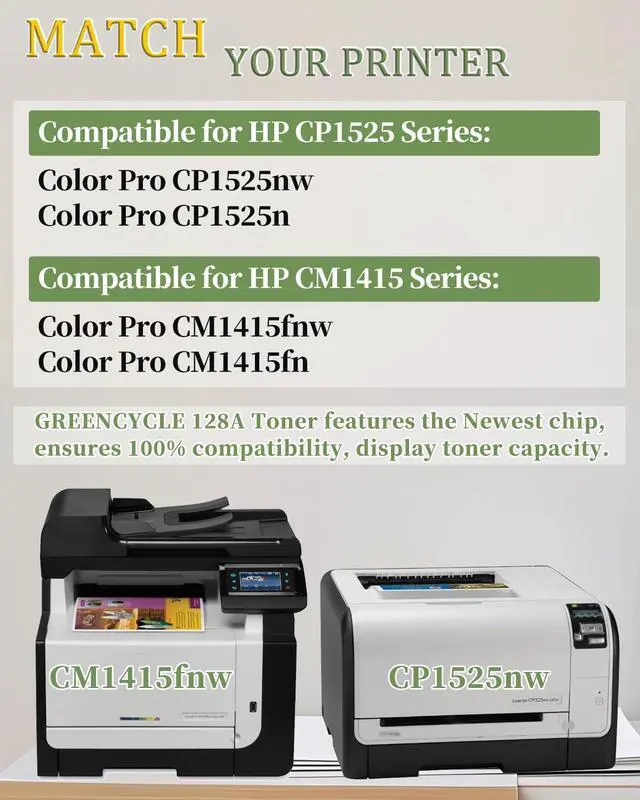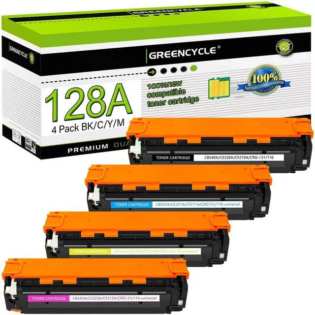 Includes: 4 Pack Set of Premium GREENCYCLE 128A CE320A Black + CE321A Cyan + CE322A Yellow + CE323A Magenta High Yield Compatible Toner Cartridge Replacement for HP 128A. Comes with a user guide for easy installation. ^^ Compatible for