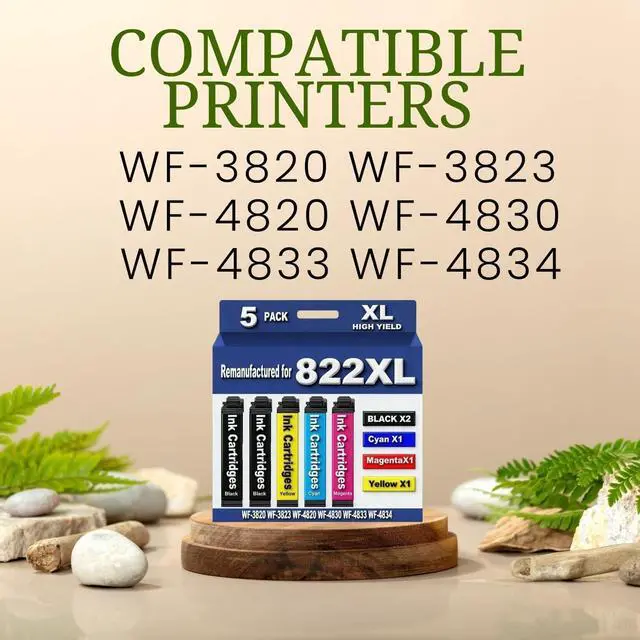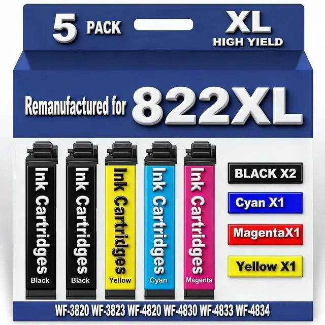 Package Contains: 5 Pack 822XL ink cartridges.2 x 822XL Black , 1 x 822XL Cyan , 1 x 822XL Magenta , 1 x 822XL Yellow (NON-OEM Cartridges)