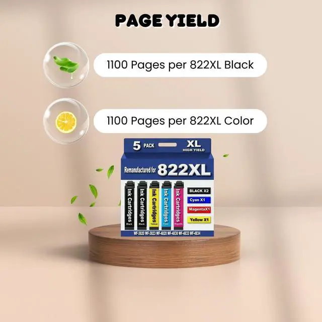 High Page Yiled: 1100 Pages per for epson 822XL Black ink cartridge/ 1100 Pages per for epson 822XL Color ink cartridge at 5% coverage