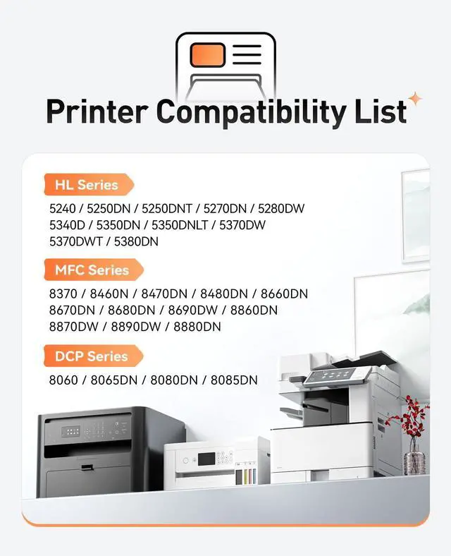 ^^ Compatible Printers: Compatible with Brother DCP-8060, DCP-8065DN, DCP-8080DN, DCP-8085DN Printer Series; HL-5240, HL-5250DN, HL-5250DNT, HL-5270DN, HL-5280DW, HL-5340D HL-5350DN, HL-5350DNLT, HL-5370DW, HL-5370DWT, HL-5380DN Printer Series; MFC-8370, MFC-8460N, MFC-8470DN, MFC-8480DN, MFC-8660DN MFC-8670DN, MFC-8680DN, MFC-8690DW, MFC-8860DN, MFC-8870DW MFC-8890DW, MFC-8880DN Printer Series.