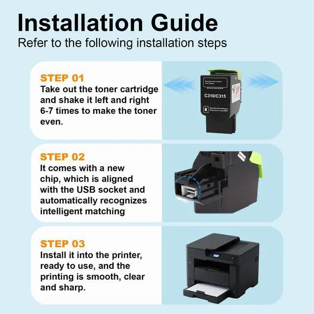 • Installation Tips: Before installing the new toner cartridge, it can be properly shaken horizontally a few times to make the toner distribution more uniform, which will make the printing effect more even and avoid the situation of varying depths and shades