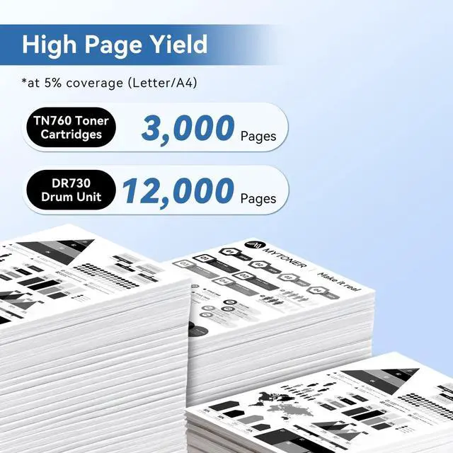 Estimated Page Yield: Each TN 760 toner cartridge can print approximately 3, 000 pages and each DR730 drum unit can print approximately 12, 000 pages (at 5% coverage - letter/A4) ^^