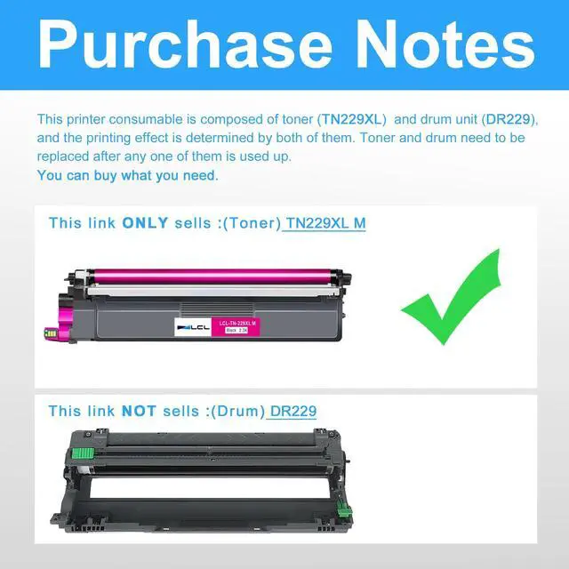 Reliable Quality: LCL TN229XL cartridge uses high quality toner, toner particle size distribution, good mobility, high transfer rate, resulting in a clear image and high gloss print effect; Printing efficiency is high, waste powder rate is low, so as to ensure sufficient page yield.