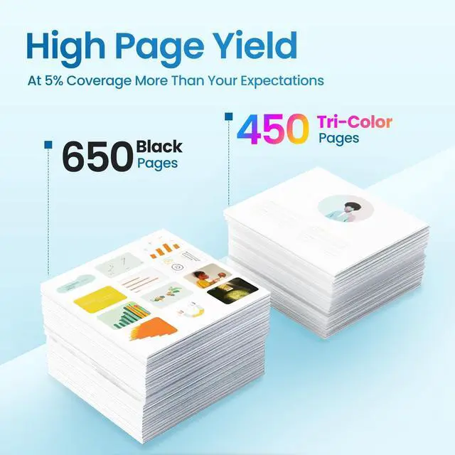 Higher Printing Page Yield: For HP 61XL High Yield Cartridges, up to 650 Pages for hp ink 61 black, 450 Pages for hp 61 ink tri-color (at 5% coverage of A4 paper).