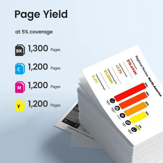 Page Yield: Black ink is 1300 pages & color is 1200 pages per cartridge at 5% coverage on letter/a4 ^^ High
