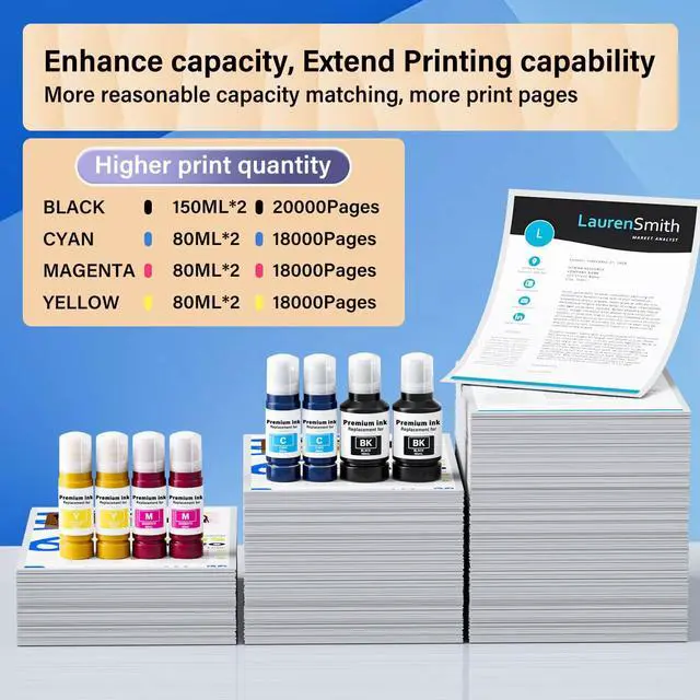 (NotSublimation) ^^ Print yield: T502 black ink (150ml per bottle) can print up to 10000 pages; T502 color ink (80ml per bottle) can print up to 18000 pages (based on 5% page coverage on A4 paper).