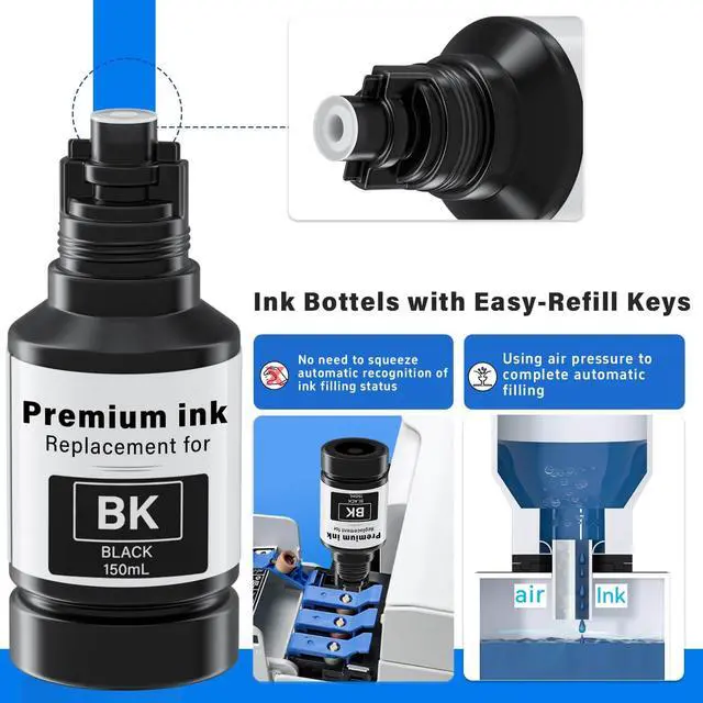 ^^ Auto-Stop Bottle: The uniquely designed T502 refill ink bottle easily snaps into place, allowing you to automatically refill your printer with ink without any hands-on effort.