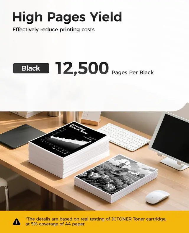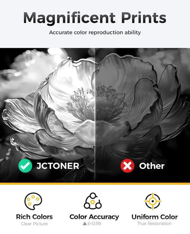 The latest chip version: The JCTONER toner cartridges are equipped with the latest version of built-in chips, ensuring perfect compatibility between each toner cartridge and the printer. This enables you to print efficiently while maintaining stability and reliability, making installation convenient without the need for manual adjustments. All JCTONER toner cartridges have undergone strict quality testing and have obtained ISO9001 certification. High-quality toner cartridges can meet the demand for high printing volume. The fine toner ensures clear and stain-free printing results and extends the lifespan of the printer. You can purchase with confidence.