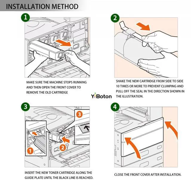 Installation method: Take out the old toner cartridge of the corresponding color, shake the cartridge horizontally 2-3 times to make the toner uniform, and put it into the printer to use ^^