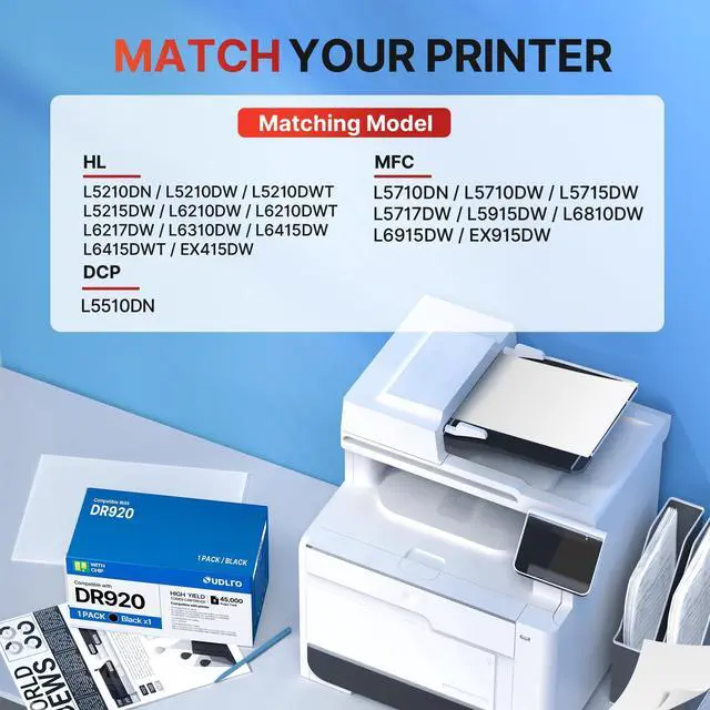 • Compatibility: dr920 drum unitL is work well with HL-L5210DN, HL-L5210DW, HL-L5210DWT, HL-L5215DW, HL-L6210DW, HL-L6210DWT, HL-L6217DW, HL-L6310DW, HL-L6415DW, HL-L6415DWT, HL-EX415DW, DCP-L5510DN, MFC-L5710DN, MFC-L5710DW, MFC-L5715DW, MFC-L5717DW, MFC-L5915DW, MFC-L6810DW, MFC-L6915DW, and MFC-EX915DW Printer.