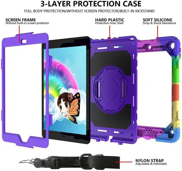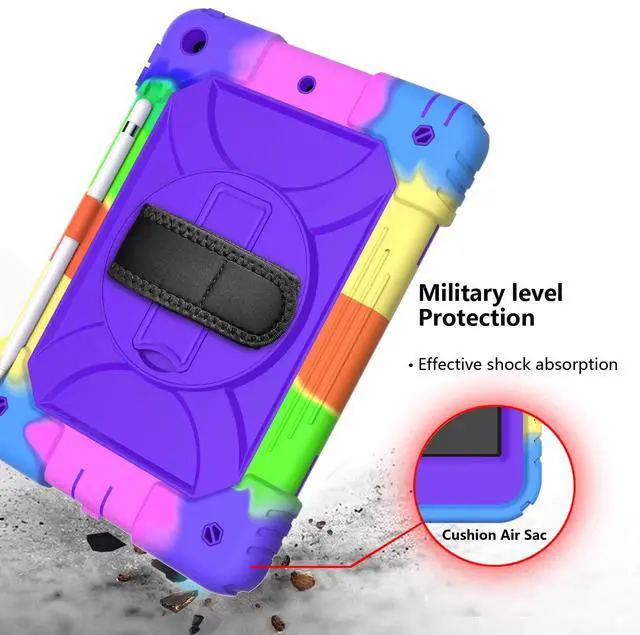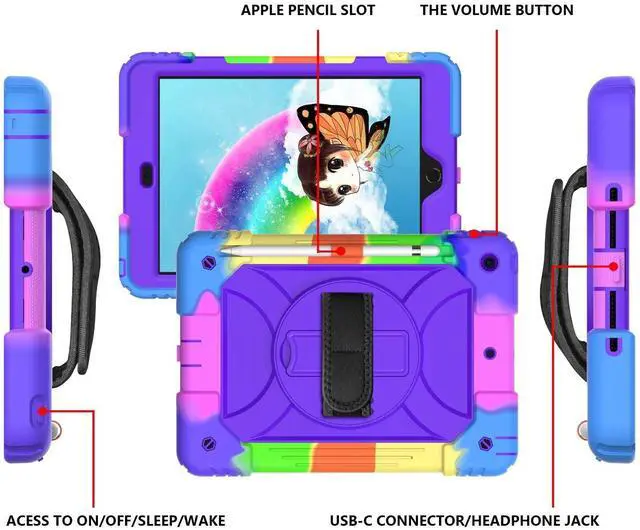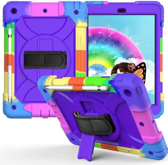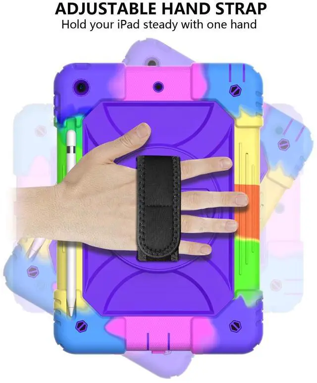 Rotating Shoulder Strap: Prevents Screen broken without compromising sensitivity and definition. Foldable and 360 Degree Stand, Convenient hands free movie viewing angles, online books Study and face time chatting, With soft handle strap, easier to use your iPad in your outdoor travelling Full body rugged Drop protector. Full access to all features (Cameras, Speaker, Ports and Buttons), Blocks dust, sand and splash from ports which lengthens the life of the deviceDouble-layer thick silicone in the corner prevents falls and other impacts. Gifts for children. Maybe you are looking for a sturdy iPad case for your baby. Strong protection, easy to carry, environmentally safe, very suitable for children, boys, girls, kindergartens, schools. Choose from a variety of colors and come and pick a Christmas present or birthday present for your baby.