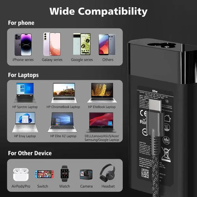 Skyvast Features: Our 65W USB C laptop charger is upgraded again with new technology and materials, the volume is more compact than other chargers, but the charging efficiency has become higher, it can be completely used as a replacement for HP 65W 45W USB C laptop charger, the charging cable is made of special materials, which have been professionally tested, and it's tougher and more convenient to use than the previous cables, either Working at home, studying, or traveling out, it is very convenient to carry ^^ CompatibilitySkyvast 65W USB-C Power Adapter for HP Chromebook X360 14 11 12 Series, HP EliteBook 735 G6/735 G5/755 G5/840 G6/840r G4/850 G6 /850 G5. HP elitebook x360 1020 G2/1030 G2/1030 G3/1030 G4/1030 G5/1030 G6/1030 G7/1030 G8/1040 G4/1040 G5/1040 G6/1040 G7/1040 G8, HP Envy, HP Envy X360 and more. ^^ CompatibilitySkyvast 65W USB C Laptop Charger for HP Spectre X2 X360 13