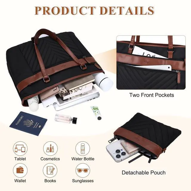 ^^ Versatile & User-Friendly: The laptop handbags features a stylish V-shaped quilted design with color-block accents, blending elegance with modern flair. The handles include a snap-on shoulder pad that keeps them together for easy hand carrying and improves comfort when worn on the shoulder. A thoughtful luggage strap allows easy attachment to rolling suitcases, making travel hassle-free. Designed with practicality and style in mind, its the perfect companion for everyday carry. ^^ Spacious & PracticalThis travel tote bag features two spacious main compartments: one with a thick padded section and velcro strap to securely hold laptops from 13 to 15.6 inches, and the other offering ample room with a dedicated water bottle pocketperfect for bottles, umbrellas, notebooks, and daily essentials. It also includes a matching small wallet that combines practicality with style, ideal for using as a work bag, briefcase, or teacher bag, it meets diverse professional needs. ^^ Secure & OrganizedMeasuring 4116.531 cm ( 16.156. 512.21 in), this computer bag offers ample storage with 7 zipper pockets on front and back. The main compartment includes multiple slip pockets, pen slots, and zipper pockets for organized storage of office supplies and daily essentials. A rear anti-theft zipper pocket provides added security for valuables. It also comes with a matching small pouch measuring 1814.5 cm ( 7.095. 71in), perfect for storing small items with style and practicality. ^^ Ideal Gift for