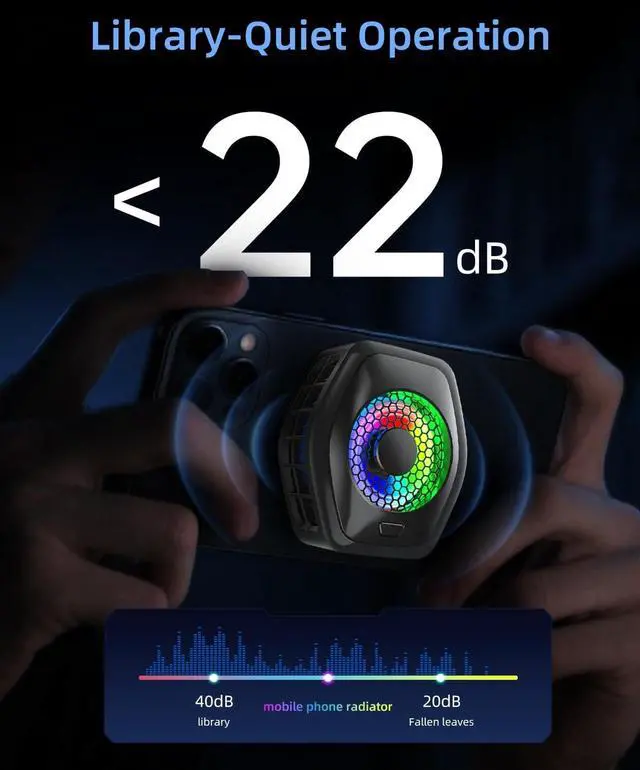 High-Performance Phone Cooler with RGB Display Stay Cool Under PressureKey Features: 3-Speed Turbo Cooling Adjustable airflow (Low/Med/High) for efficient heat dissipationduring gaming, streaming, or heavy use. Real-Time Temp Display Built-in digital screen tracks device temperature in F/C forprecise monitoring. Dynamic RGB Lighting Color-shifting LEDs (BlueRed) visually indicate cooling status. Universal Compatibility Magnetic + clip-on design fits most smartphones (iPhone, Samsung, etc. ). Ultra-Quiet Operation <22dB noise level for distraction-free use.