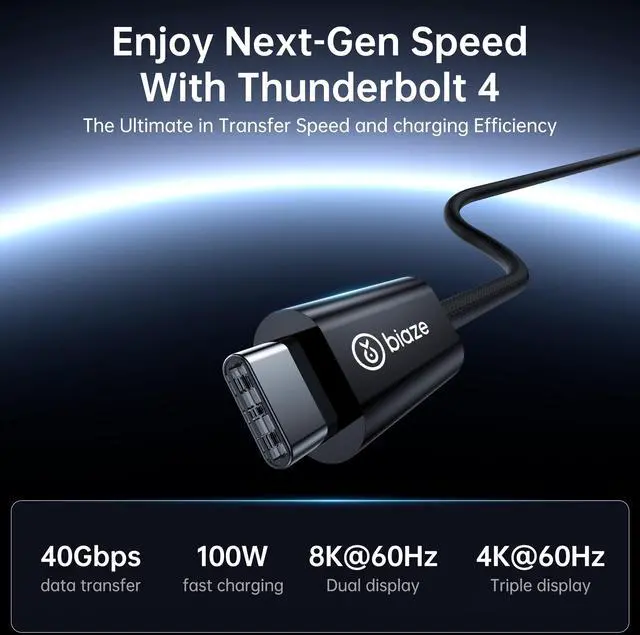 Notice: if you connect to USB C port for video output, please make sure your device supports DisplayPort Alternate Mode (Alt Mode). This setup can only produce one 4K display. ^^ High-Speed Data TransferTransfer files quickly with 480Mbps data transfer speeds. (Does not support video output) ^^ Versatile CompatibilityThunderbolt 4 Cable fully supports all the awesome features of Thunderbolt 4 and USB4, while also being fully backward compatible with Thunderbolt 3 and USB 3 hosts and devices. A plug and play safe solution Compatible with any Mac, PC, iPad, Chromebook, Surface tablet or ny other device, display, or power supply with Thunderbolt 3, Thunderbolt 4, USB-C, or USB4 port. ^^ Durable DesignReinforced nylon exterior and a robust core ensure this cable withstands up to 5, 000 bends, outlasting other brands.