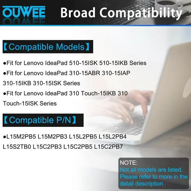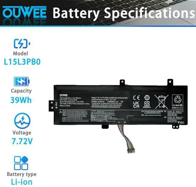 Capacity: 39Wh 5055mAh. ^^ Compatible Part NumberL15M2PB5 L15M2PB3 L15L2PB5 L15L2PB4 L15S2TB0 L15C2PB3 L15C2PB5 L15C2PB7. ^^ Replacement For LaptopLenovo IdeaPad 510-15ISK/15IKB 310-15ABR/15IAP/15IKB/15ISK 310 Touch-15IKB/15ISK Series. ^^ ConnectorBefore placing your order, Please refer to the picture and check it. Because the products produced by different factories will have differences, such as size, cable length, interface, etc. ^^ Use SkillsIf the new battery is not recognized during the initial installation, please reinstall and check if the interface is fully connected. Discharge the new battery to 5% (not 0%), then charge and cycle 3-4 times to wake up the new battery.