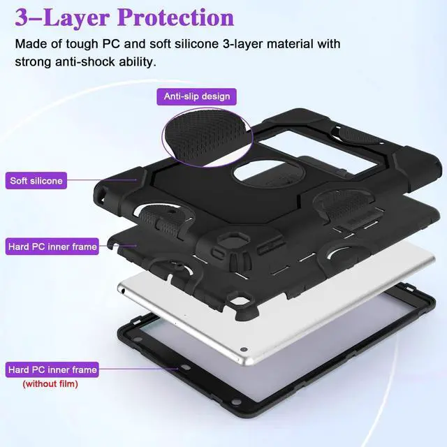 • Shockproof Rugged Design: iPad 10.2 Case made of durable Hard PC+Silicone, 3-layer Full Body protection structure, provide a perfect protection, protects your iPad 9th/ 8th/ 7th Generation from scratches and accidental drops, bumps and impacts