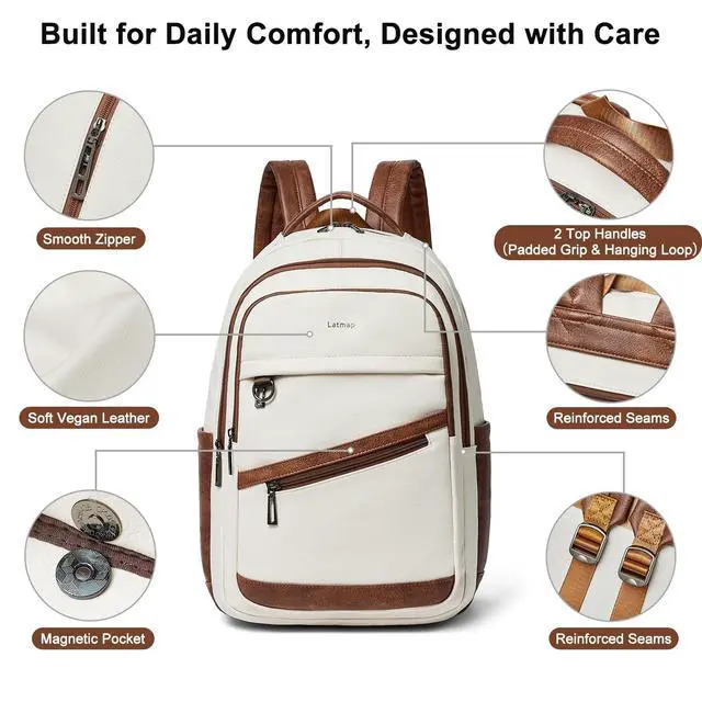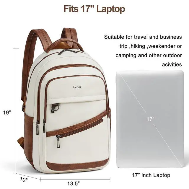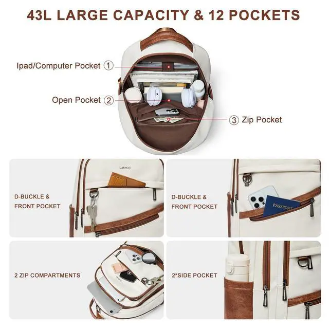 Organized Storage: Measuring 13.5" x 10" x 19", this travel backpack for women offers a roomy 43L capacity with 12 functional compartmentsincluding a padded laptop sleeve and side bottle pockets. Whether youre heading to class or packing for a short trip, its the ideal college bookbag or daypack to keep everything organized. ^^ Soft Vegan Leather with