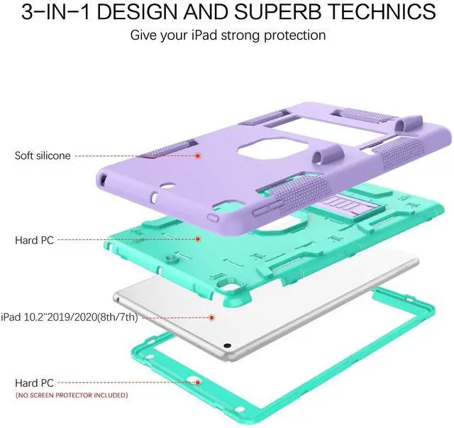 (ATTENTION: NO Screen Protector Included) ^^ Advanced 3 Layer ProtectionPremium hybrid hard Polycarbonate (PC) + soft Silicone rubber + open front hard Polycarbonate (PC) materials withstands drop, bump and shock with four corner cushioning for protection, safe for the Kids. ^^ Built-in Pencil Holder & Kickstand this shockproof tablet case has a built-in sturdy kickstand, you can adjust for optimal viewing and typing positions based on your needs. Designed with a pencil holder easily to carry your Apple pencil with your device.