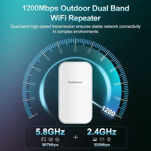 Dual-Frequency High-Speed TransmissionTODAAIR AC1200 outdoor wifi extender supports dual bands of 2.4GH z/300Mbps and 5GHz/867Mbps, ensuring a stable network connection in complex environments. ^^ Intelligent Reset, Automatic RecoveryIf The Repeater Encounters Any Faults Or Abnormalities During Operation, The Watchdog Function Will Immediately Trigger The Intelligent Reset Mechanism. This Means That Without Manual Intervention, The Repeater Can Automatically Restart And Restore To Normal Working Condition, Ensuring That Your Network Connection And Data Transmission Are Always Smooth And Unobstructed. ^^ Supports 2 Working Modes TODAAIR wifi extender supports relay mode and access point mode.