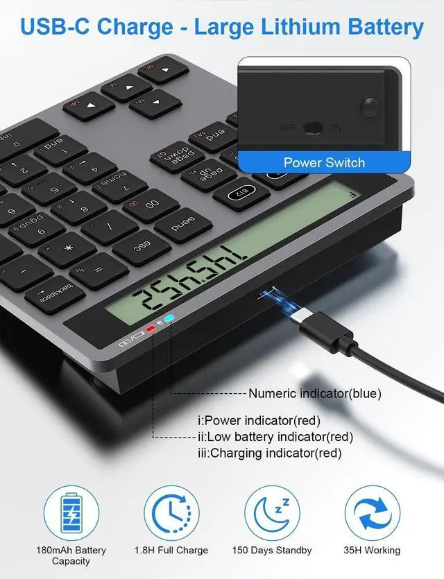 [Note: In calculator mode, refer to the characters marked in yellow for input operations, and in keyboard mode, refer to the characters marked in white. ] ^^ [High-Capacity Rechargeable Battery] Built-in 180 mAh lithium rechargeable battery. The Bluetooth numeric keypad is easily recharged through the included type C cable, no need to change the battery and easy to use. It can be fully charged in 1.8 hours and can be used continuously for about 35 hours. It is also an energy-saving design that automatically enters sleep mode if there is no operation for 20 minutes. Press any key can wake up the Bluetooth number pad within 3 seconds. ^^ [Bluetooth Wireless +Type-C Wired Dual Mode Connection] Supports Bluetooth 5.0 and Type-C wired dual mode connection, easily meets various usage scenarios such as laptops, desktop computers, smartphones, etc., improved stability and efficiency.