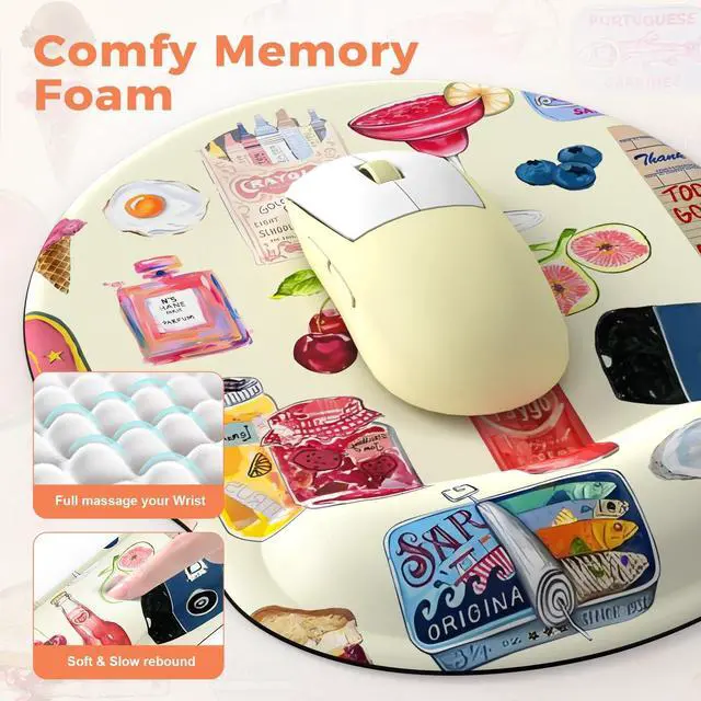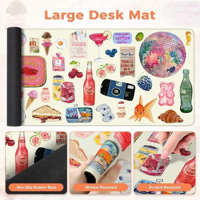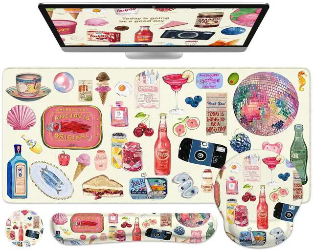 Feature: All-in-One Ergonomic SupportThe set includes a mouse pad, keyboard wrist rest, ergonomic keyboard pad, and coasterall ergonomically designed with soft, slow-rebound memory foam to relieve wrist strain and support you through long work or game sessions. Anti-Slip Design That Stays PutThe desk blotter mat, mouse pad wrist support, keyboard pad and coaster. Each piece is equipped with a grippy rubber base to keep everything securely in place. No slipping, no bunchingjust smooth, uninterrupted productivity. Durable & Eye-CatchingMade with high-quality Lycra fabric and stitched edges, the computer pads for a desk surface is smooth for precise mouse movement, while the durable build resists wear and tear. The vintage design make your desk setup pop with personality. Perfect for Creatives, Students, or Gift GivingWhether you're a design lover, gamer, or remote worker, this stylish and supportive desk set is a fun upgrade for any setupand makes a cool gift for friends, coworkers, or yourself.