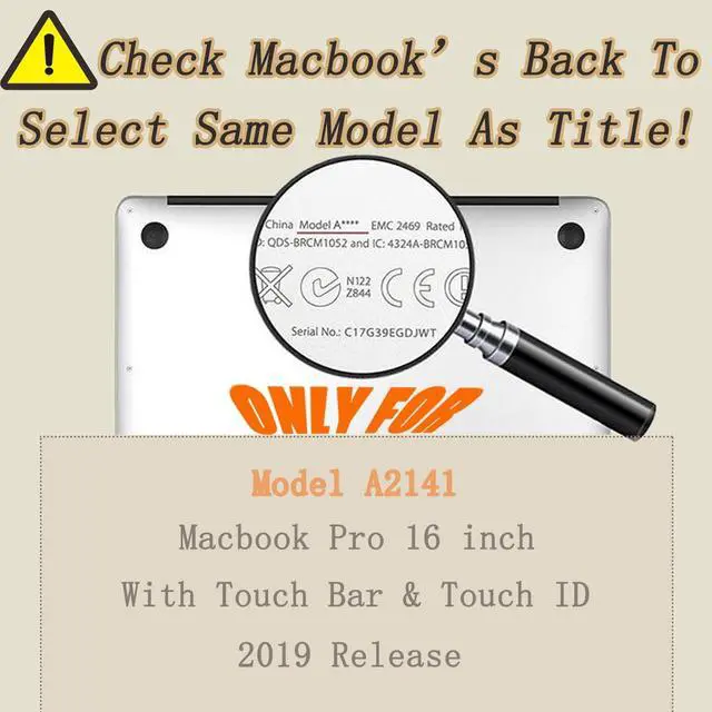 Case Only Compatible with: Model A2141(Macbook Pro 16" with touch bar and touch id, Release 2019-2020)We provided the model number location picture at the picture section. Please check your Macbook model "Axxxx" at the back of the laptop and order the correct model protective case.
