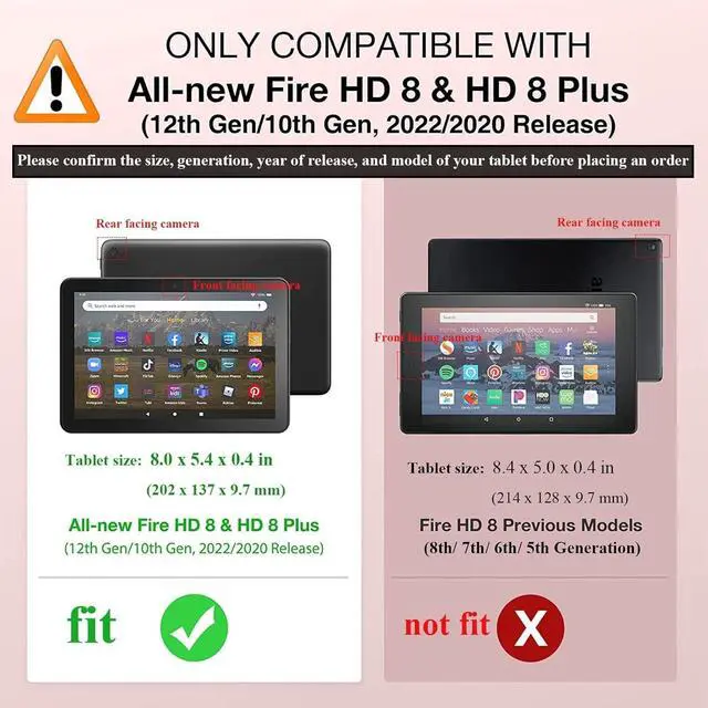 Compatible Models: for Kindle Fire HD 8 (12th Generation, 2022 Release), 8.0 inch; for Kindle Fire HD 8 Plus (12th Generation, 2022 Release), 8.0 inch; for Kindle Fire HD 8 (10th Generation, 2020 Release), 8.0 inch; for Kindle Fire HD 8 Plus Tablet (10th Generation, 2020 Release), 8.0 inch; NOT fit other tablet models.