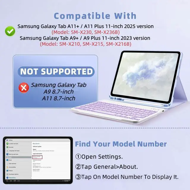 Compatible ModelsThis keyboard case is compatible with Samsung Galaxy Tab A11+ / A11 Plus 11-inch 2025 version (Model: SM-X230, SM-X236B); compatible with Samsung Galaxy Tab A9+ / A9 Plus 11-inch 2023 version (Model: SM-X210, SM-X215, SM-X216B).