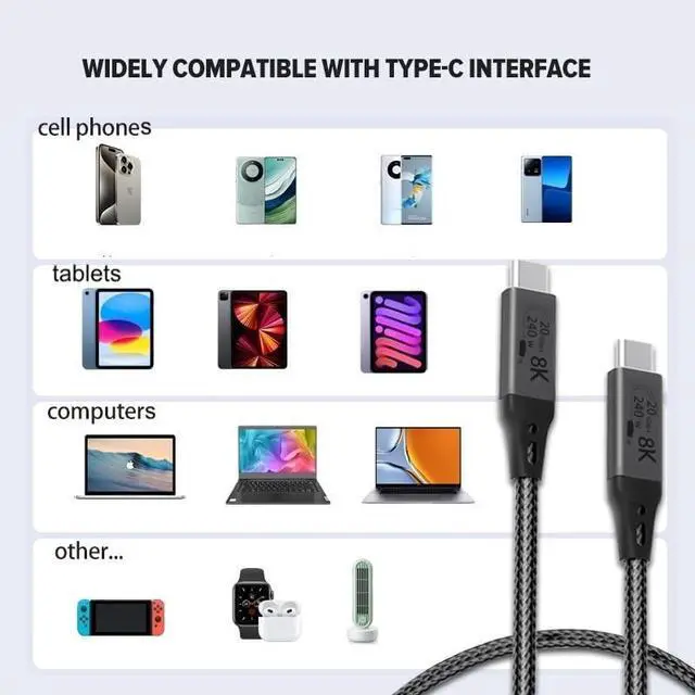 LIGHTENING-FAST DATA TRANSFER: With 20 Gbps data transfer rate, you can move movies, music, and large files between your devices in seconds. 8K at 60Hz or 8K at 144Hz. The USB-4 Cable is designed to work flawlessly with virtually any USB-C device, including phones, tablets, and laptops. Its the perfect accessory for anyone looking to enhance their connectivity options. COMPATIBLE WITH THE FOLLOWING DEVICES (*Check that it takes USB-C)iPad Pro 12.9 (5th generation), iPad Pro 12.9 (4th generation), iPad Pro 12.9 (3rd generation), iPad Pro 12.9 (2nd generation) iPad Air (4th generation), iPad mini (6th generation) MacBook Pro 14 (2021) MacBook Pro (M1, 2020)MacBook Pro 15.4 (2019/2018/2017/2016)MacBook Pro 13.3 (2020/2019/2018/2017/2016)MacBook Air (2020/2019/2018)MacBook Pro 16 (2021) Samsung Galaxy Note 10+/10/9/8Samsung Galaxy S21/S21+/S20/S10+/S10e/S10/S9+/S9Google Pixel 3/4/5/6Lenovo Yoga 14sLenovo ThinkPad X1 SeriesHP Spectre SeriesMade with care and with attention to quality and function. The brand names and logos used in this listings are the registered trademarks of their respective owners. Any use of a brand name or model designation for this product is made solely for purposes of demonstrating compatibility.