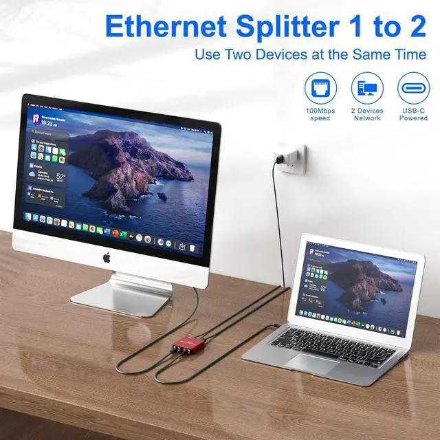 Ethernet Splitter: This splitter allows you to connect 2 devices to a single Ethernet network port, saving valuable desk space and reducing the need for additional cables. It is compatible with Cat5/5e/Cat6/Cat7/Cat8 cables and supports data transfer rates of up to 1000 Mbps. ^^ 2