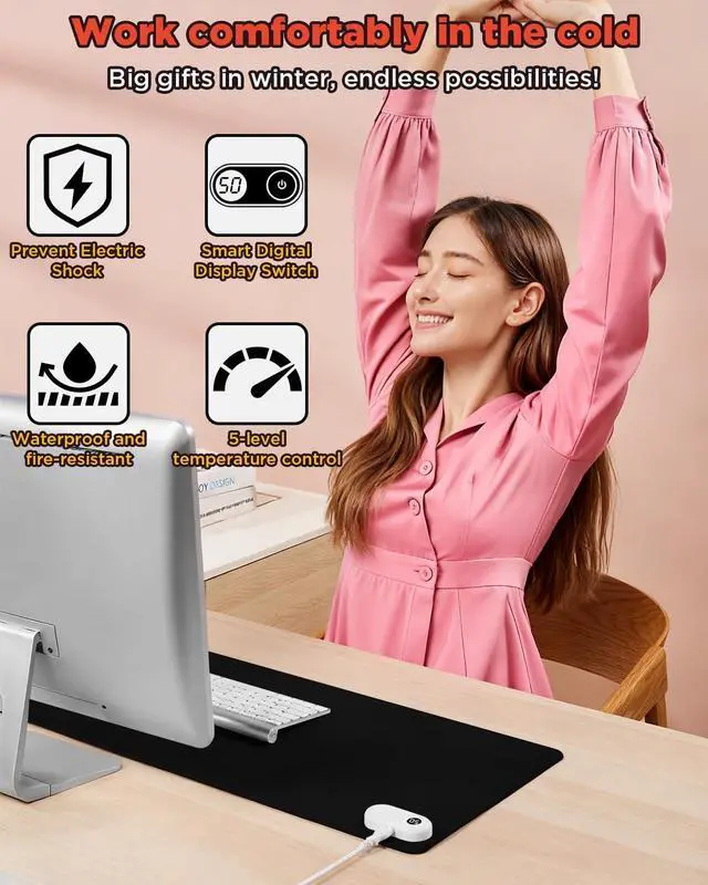 10-Second Rapid HeatingExperience instant warmth with advanced heating technology that reaches your desired temperature in just 10 seconds, keeping your hands comfortable during long work sessions. ^^ 5-Level Adjustable TemperatureChoose from 30C, 35C, 40C, 45C, or 50C with clear digital display, allowing personalized comfort for different seasons and preferences. ^^ 3-Hour Auto Shut-Off & Safety ProtectionBuilt-in safety timer automatically powers off after 3 hours to prevent overheating and ensure peace of mind during use. ^^ Premium PVC Leather & Large SizeDurable, easy-to-clean artificial leather surface measures 31.5" x 13", providing ample space for mouse, keyboard, and paperwork.