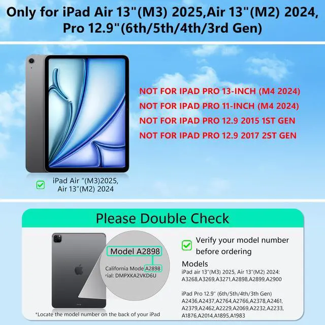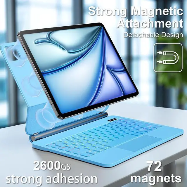 : Designed for iPad Air 13-inch (M3 2025 / M2 2024) and iPad Pro 12.9 -inch models, including Air 13 M3 2025 (A3268, A3269, A3271), Air 13 M2 2024 (A2898, A2899, A2900), iPad Pro 12.9 6th Gen 2022 (A2436, A2437, A2764, A2766), iPad Pro 12.9 5th Gen 2021 (A2378, A2379, A2461, A2462), iPad Pro 12.9 4th Gen 2020 (A2229, A2069, A2232, A2233), iPad Pro 12.9 3rd Gen 2018 (A1876, A2014, A1895, A1983); not compatible with other iPad models due to different magnet layouts; contact us if unsure. ^^ Backlit Keyboard for iPad Air 13 inch and iPad