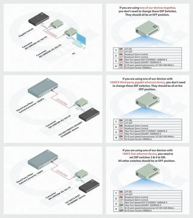 Operating temperature: 0 to 70 degree celsius CE, FCC, ROHS, LVD certified Supports Jumbo Ethernet frames up to 9000 bytes (if needed, configurable by dip switches) Supports LLF feature - Link Loss Feature - (if needed, configurable by dip switches)Media converter will extend Your LAN network with any standard Ethernet interface to distances with 2 km or less - you no need to use attenuator also for significantly less distances than 2 km as well. Setup of these units are really easy as the 3 steps shown in picture gallery, and all default settings will work for all of your cases, but for sophisticated users we had created some more customized settings available via dip switches on unit's back panel. It's always good to have versatile and adaptive unit to all Your cases! Questions during installation? Questions during considering a purchase? We are always here to answer You and guide You through!