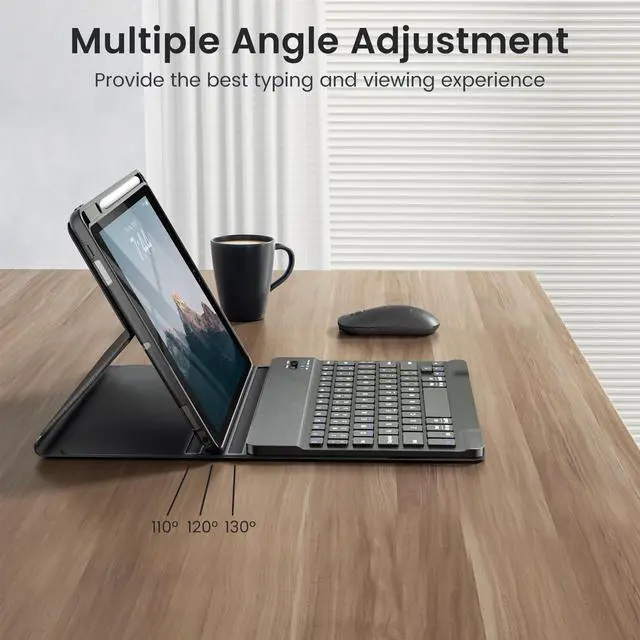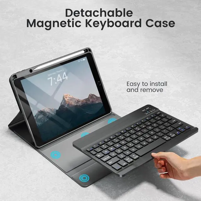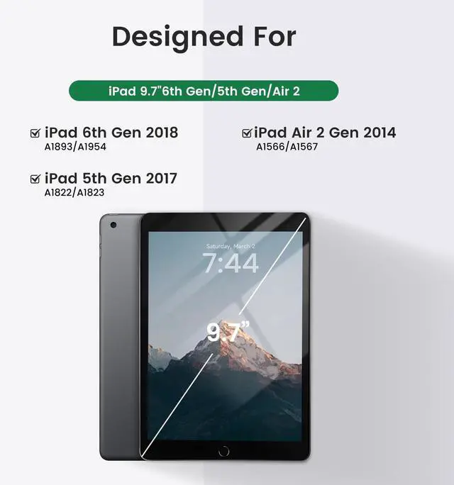 Fit iPad Models: A1822/A1823/A1893/A1954/A1566/A1567. NOT Compatible with any other iPad models. Please check model number Axxxx on the back bottom of your iPad to find the model number ^^ DETACHABLE BLUETOOTH KEYBOARDOur keyboard case has a removable wireless keyboard that allows you to adjust and change keyboard positions anytime, anywhere. The keyboard is slim, lightweight, and easy to carry. It only takes 2 hours to charge and lasts up to 168 hours of work time or 150 days on standby ^^ AUTO SLEEP/WAKE FUNCTIONWith the auto sleep/wake function, this iPad case helps save battery life. When the case is closed, the iPad goes into sleep mode, and when opened, it wakes up ^^ EASY ACCESSPrecise Cutouts on the iPad Air 2 Keyboard Case allow easy access to all ports, camera, speakers, headphones, and volume controls ^^ FULL PROTECTIONOur keyboard case has a sturdy TPU plastic shell and full edge coverage that protects your iPad from overheating and accidental drops. The honeycomb design has the added function of heat dissipation and shockproof technology, which can help extend the lifespan of your iPad over 30%