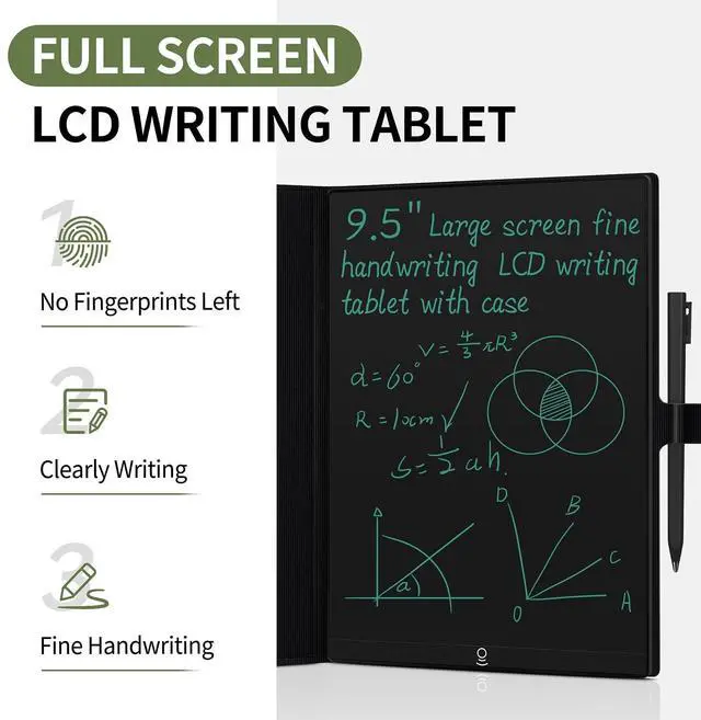 High-quality LCD Writing Tablet: The 9.5 -inch writing tablet is equipped with leather case to effectively safeguard the recorded information and prevent screen scratches; The writing screen is 93.5 % of the screen. More comfortable to record, communicate, study, work or play games; Measuring just 0.2 inches thin and weighing only 0.6 pounds, it can effortlessly fit into school bags, handbags or travel bags ^^