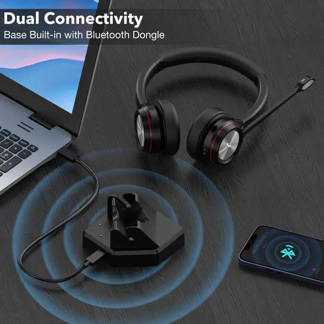 ^^ Dual Connectivity: With Bluetooth Version 5.2, the wireless office headset with microphone ensures a stable connection and superior audio quality. This wireless Bluetooth headset with charging base includes a pre-paired Bluetooth Dongle for easy setup. This wireless headset for work supports multi-point technology, allowing dual connectivity for seamless switching between calls on two devices simultaneously.