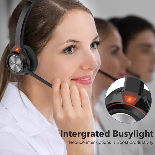 ^^ Convenient Features: Enhance productivity with this Bluetooth headset's convenient features like voice assistant, busy light, and mute button for call management. Enjoy all-day comfort with its lightweight design, adjustable headband, and soft ear cushions. Plus, this wireless headset with microphone for PC comes with a 2-year warranty.