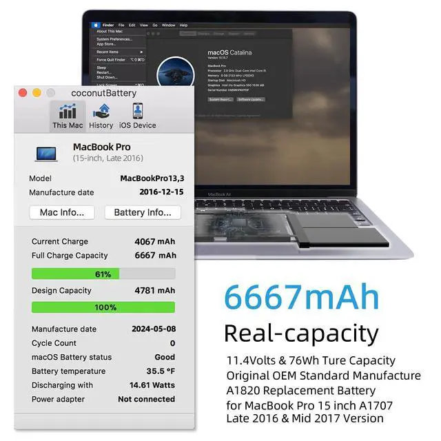 OEM Standards Manufacture: Real capacity 11.4V olts=76Wh 6667mAh. Same manufacture standards as the original A1820 battery for MacBook Pro 15" A1707. Provide up to 1000+ recharge cycles, and support fast charging with overcharge and discharge circuit protection ^^
