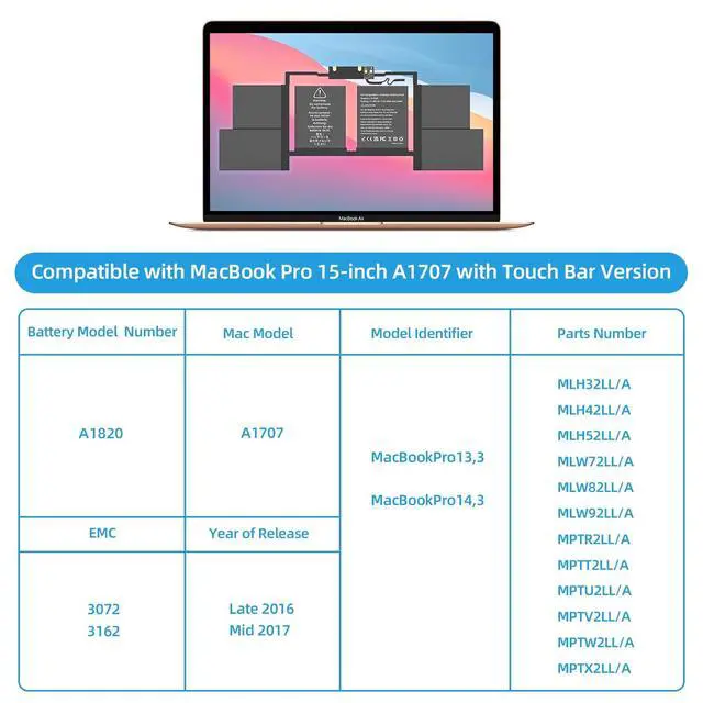 Replacement Battery Models: Replace for MacBook Pro 15inch A1707 with touch bar versions replacement battery, battery type A1820.
