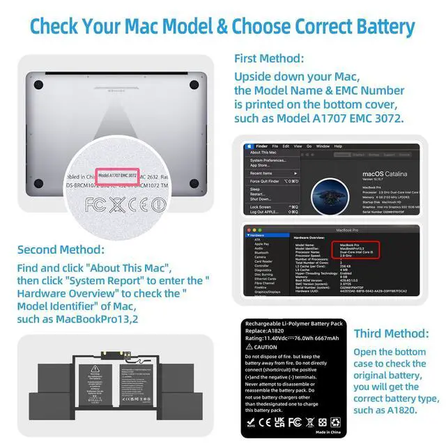 Get Correct Battery: First, upside down your Mac to get the exact model name & EMC numbers; Second, find and click on About This Mac, and the system model and release year is on the pop window; Third, follow the method 2 and then click on "System Report" the model identifier is on the "Hardward Overview"; Fourth, check the original battery to get the exact battery model number ^^